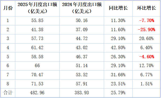 表二2025年1—8月鋰離子電池出口額月度變化情況