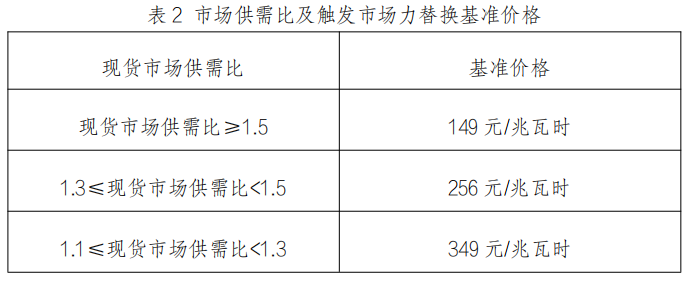 報(bào)價(jià)替換出清方面,供需比范圍內(nèi)將觸發(fā)市場力監(jiān)測的該類型電源高于基準(zhǔn)價(jià)格的報(bào)價(jià)段進(jìn)行替換,按替換后報(bào)價(jià)進(jìn)行日前及實(shí)時(shí)市場出清。替換價(jià)格暫定標(biāo)準(zhǔn)如表2所示,供需比范圍及對(duì)應(yīng)替換價(jià)格由政府相關(guān)部門進(jìn)行明確,后續(xù)進(jìn)行調(diào)整。當(dāng)同一類型電源連續(xù)5日未通過事前監(jiān)管時(shí),如第6日繼續(xù)未通過事前監(jiān)管,則從第6日起按替換基準(zhǔn)價(jià)格的0.95倍執(zhí)行,直至該類型電源通過事前監(jiān)管后恢復(fù)。