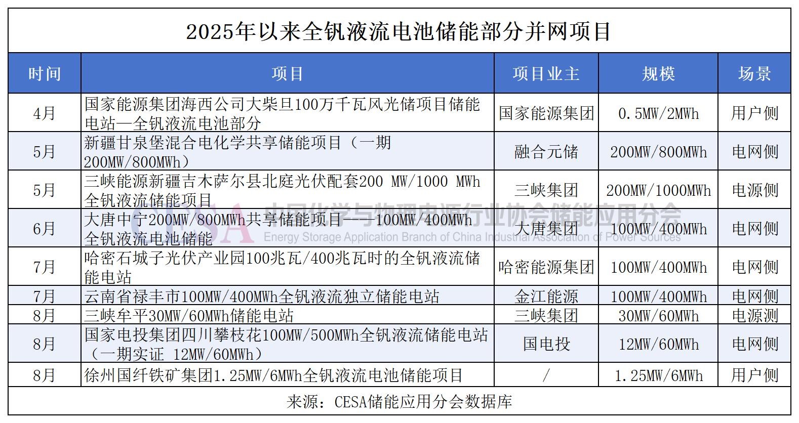 2025年以來,全釩液流電池的規(guī)模化應(yīng)用加速,據(jù)CESA儲(chǔ)能應(yīng)用分會(huì)產(chǎn)業(yè)數(shù)據(jù)庫不完全統(tǒng)計(jì),截至8月底,液流電池儲(chǔ)能并網(wǎng)規(guī)模達(dá)0.59GW/3.32GWh,一個(gè)明顯特征是大型標(biāo)桿項(xiàng)目的密集落地,凸顯全釩液流電池儲(chǔ)能支撐百兆瓦級(jí)規(guī)模應(yīng)用的能力進(jìn)一步夯實(shí)。