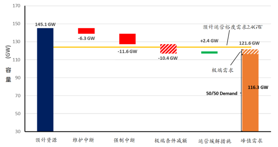 中西部可靠性組織-薩斯克電力公司(MRO-SaskPower):夏季期間,在正常情況下該區(qū)域電力市場(chǎng)不會(huì)出現(xiàn)容量限制或可靠性問題。然而,如果發(fā)電機(jī)組出現(xiàn)強(qiáng)制中斷(Forced Outages)[13]情況(中斷概率為21.5%,損失出力約35萬千瓦),同時(shí)疊加高于歷年均值水平的負(fù)荷需求,薩斯克電力公司需從鄰近區(qū)域電力市場(chǎng)短期購電,并啟動(dòng)需求響應(yīng)、調(diào)整維護(hù)計(jì)劃以及采取臨時(shí)停電等措施,以彌補(bǔ)電力供應(yīng)缺口。