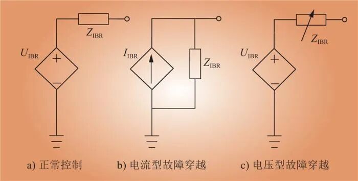 若電源沒有處于故障穿越控制狀態(tài),逆變器端口的電壓輸出將主要依賴于外環(huán)對內環(huán)所設定的電壓值。在此情況下,構網型變流器的運行受給定的無功功率及并網點電壓的調控,可被視為一個受控電壓源與小阻抗的串聯(lián)組合,如圖3所示。圖3中,UIBR為等效電壓源的電壓幅值;IIBR為等效電流源的電流幅值;ZIBR為等效阻抗。