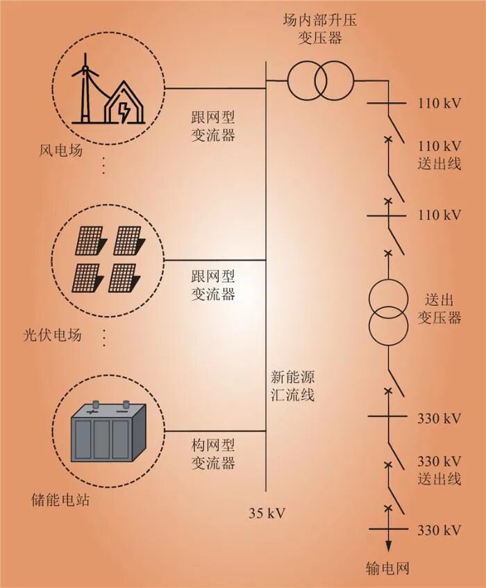 隨著并網新能源規(guī)模的不斷擴大,電力系統(tǒng)的故障特性變得日益復雜,這對輸電系統(tǒng)中繼電保護元件的正常運作構成了更為嚴重的威脅。特別地,針對110 kV和330 kV等級的關鍵送出線路保護,其適應性的提升與改進配置方案的制定成為了電力系統(tǒng)運行管理部門及繼電保護設備制造商共同關注的焦點問題,亟待深入研究與有效解決。主流新能源送出電網結構如圖4所示,其中風電和光伏采用跟網型變流器,儲能采用構網型變流器。