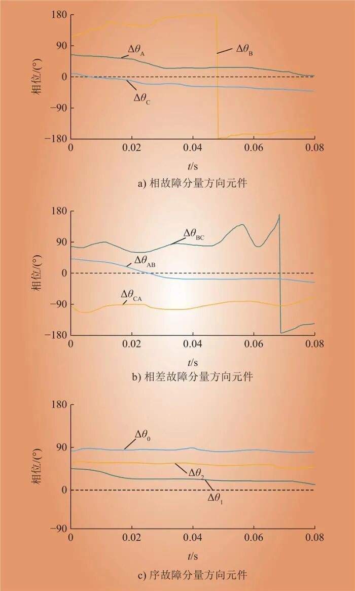 分析圖6可得:構網變流側的正負序阻抗比kZ12存在一定波動,由此導致ΔθA、ΔθB、ΔθC、ΔθAB、ΔθBC、ΔθCA呈現(xiàn)出一定程度波動性,進而影響了相量方向元件故障判斷的穩(wěn)定性。當采取特定限流措施時,構網變流側的正序阻抗出現(xiàn)一定程度波動,導致Δθ1出現(xiàn)一定程度波動,可能導致正序故障分量方向元件無法穩(wěn)定判斷。構網變流側的負序和零序阻抗相對穩(wěn)定,Δθ2和Δθ0基本穩(wěn)定在動作區(qū)內,因此負序和零序方向元件均能夠在動作區(qū)內維持穩(wěn)定。