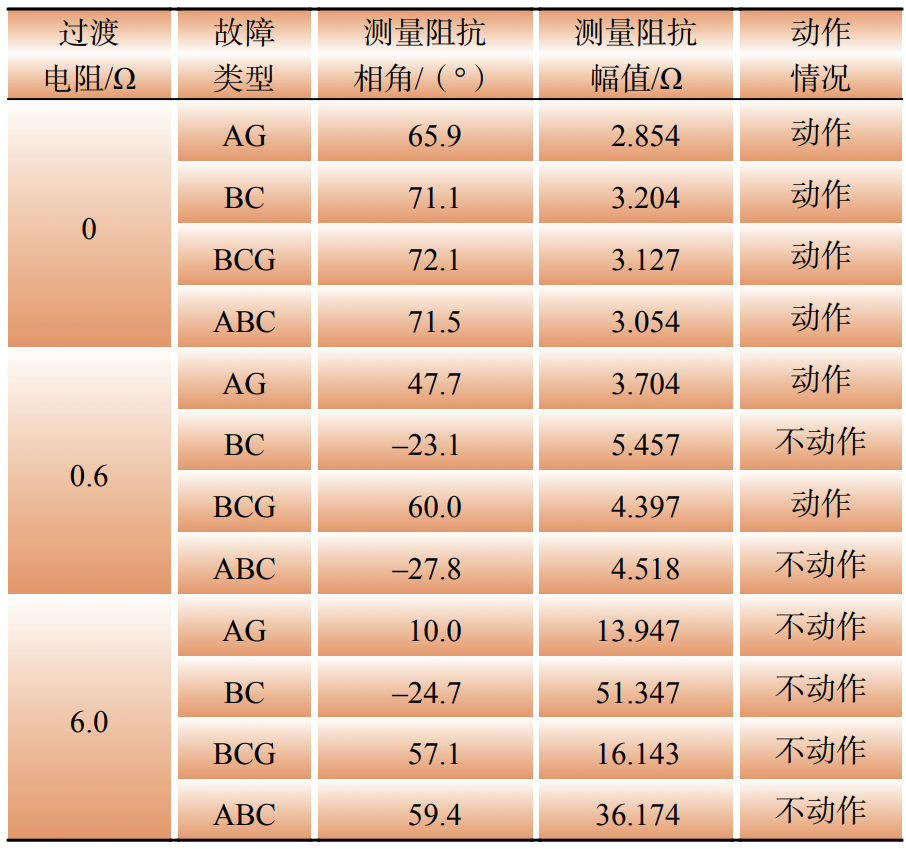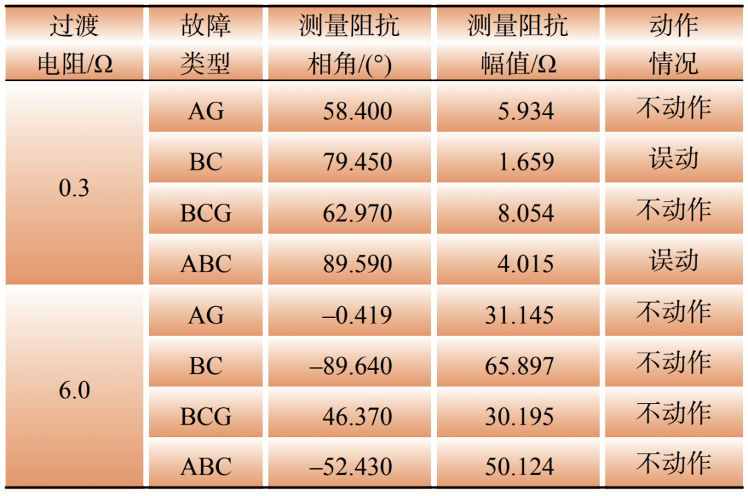從表3中可以看出,在沒有過渡電阻的情況下,測量阻抗能夠反映保護與故障位置的線路阻抗,保護元件能夠正常動作。然而,當存在0.6 Ω的過渡電阻時,構網變流側測量阻抗會偏移至保護動作區(qū)外。進一步地,過渡電阻增大至6 Ω時,對于部分故障類型,同樣會產生偏移。由此推斷,在區(qū)內發(fā)生故障的情況下,構網變流側距離保護元件對于過渡電阻的耐受能力和提供的故障電流相關,與典型弱饋系統(tǒng)特征較為類似。
