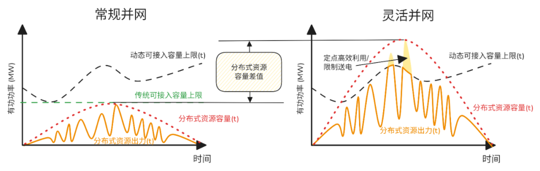 圖1:采用余電上網(wǎng)曲線前后的分布式電源發(fā)電容量及配電承載力對比[12]