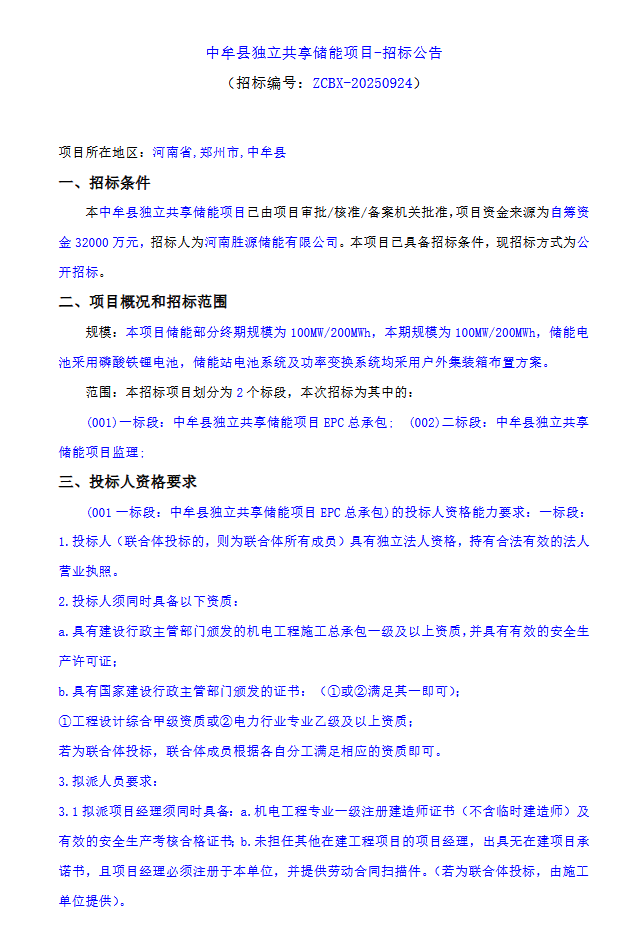 (001)一標(biāo)段:中牟縣獨(dú)立共享儲(chǔ)能項(xiàng)目 EPC總承包