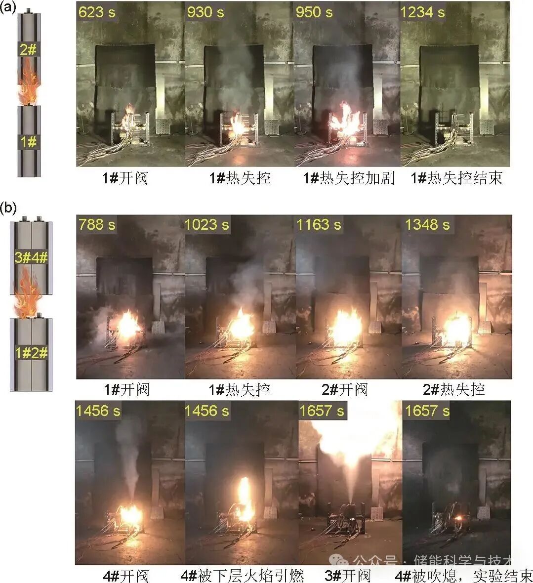 目前針對(duì)儲(chǔ)能電池火蔓延特性的相關(guān)研究尚不充分,特別是缺少在火蔓延觸發(fā)前的過(guò)程中,針對(duì)上層電池能量累加過(guò)程的定量分析,火蔓延觸發(fā)過(guò)程的能量傳遞機(jī)制尚不明確。鑒于此,本工作針對(duì)雙層100 Ah磷酸鐵鋰電池模組,設(shè)計(jì)雙層電池?cái)?shù)量分別為1節(jié)、2節(jié)和3節(jié)的實(shí)驗(yàn)方案,探究?jī)?chǔ)能電池火蔓延特性,定量研究在觸發(fā)頂部電池火蔓延的過(guò)程中,底部各節(jié)電池的累計(jì)傳遞能量,并解耦不同路徑的傳熱量。研究揭示了火蔓延觸發(fā)過(guò)程的能量傳遞機(jī)制,為儲(chǔ)能電池火蔓延的抑制和系統(tǒng)安全設(shè)計(jì)提供指導(dǎo)意見(jiàn)。