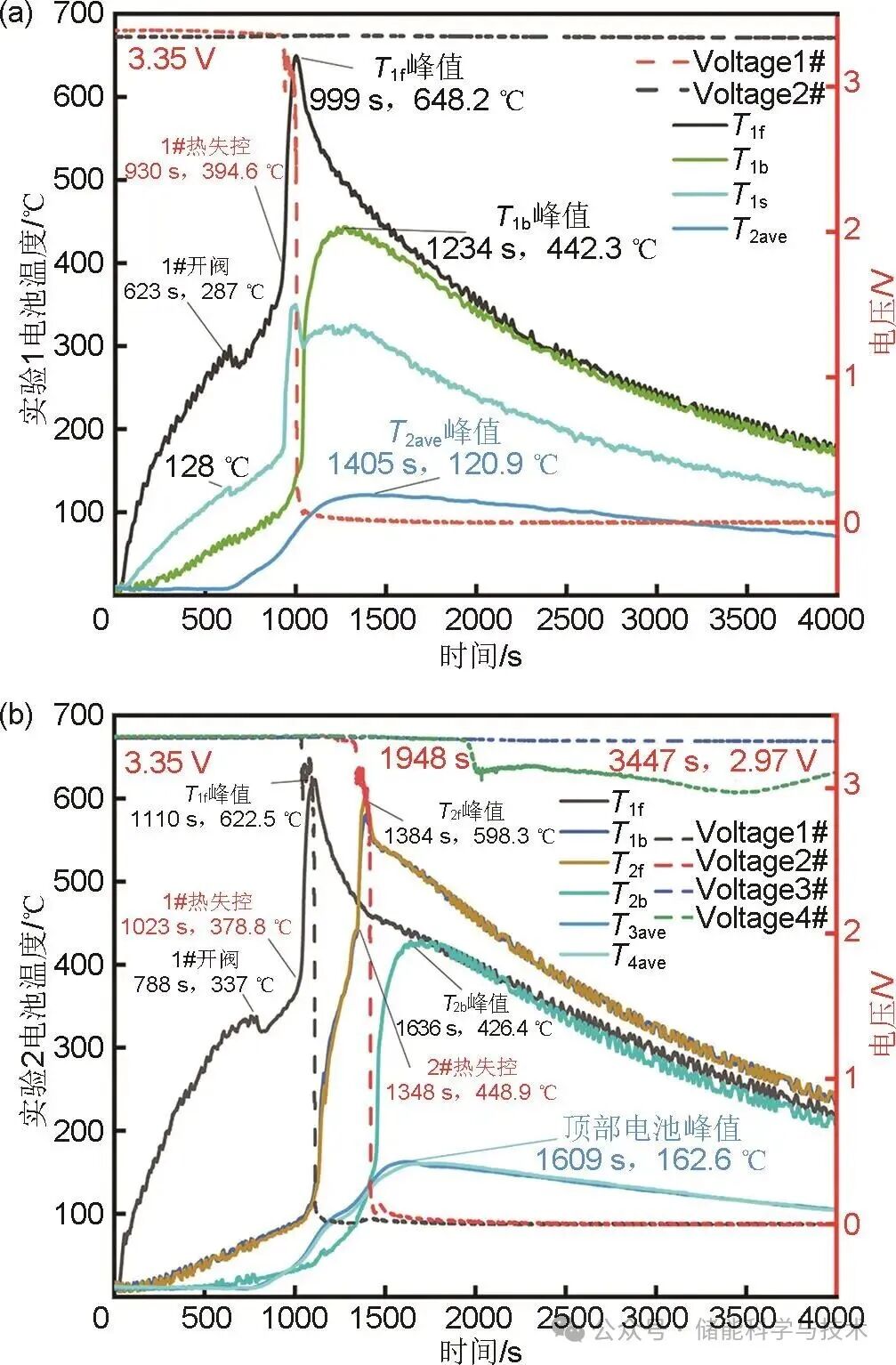 圖6(b)展示了實(shí)驗(yàn)2中各節(jié)電池的溫度變化。1#電池于788 s發(fā)生開(kāi)閥,此時(shí)正面(加熱面)溫度T1f為337 ℃,當(dāng)加熱過(guò)程進(jìn)行到1023 s,1#電池發(fā)生熱失控,此時(shí)T1f為378.8 ℃,并于1110 s達(dá)到峰值622.5 ℃。1348s時(shí)2#電池發(fā)生熱失控,此時(shí)T2f為448.9 ℃,并于1384 s達(dá)到峰值598.3 ℃。T2b于1636 s達(dá)到峰值426.4 ℃,整個(gè)熱失控過(guò)程持續(xù)了613 s,1#與2#的熱蔓延時(shí)間間隔為325 s。圖6(b)中記錄了頂部3#電池和4#電池的平均溫度T3ave和T4ave,2條溫度曲線幾乎重合,說(shuō)明底部電池對(duì)頂部電池的加熱效應(yīng)是幾乎相同的,頂部2節(jié)電池的平均溫度于1609 s達(dá)到峰值162.6 ℃。整個(gè)過(guò)程中,1#電池與2#電池的電壓在熱失控時(shí)從3.35 V驟降到1 V以下,3#電池電壓一直沒(méi)有發(fā)生波動(dòng),而4#電池的電壓在1948 s時(shí)發(fā)生下降,于3447 s降低至2.97 V后發(fā)生回升,這是由于電池受到加熱發(fā)生局部?jī)?nèi)短路,但后續(xù)失去了加熱源,并受到熱對(duì)流和熱輻射的散熱影響,局部?jī)?nèi)短路停止,沒(méi)有進(jìn)一步發(fā)生熱失控。