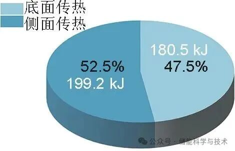 頂部電池通過(guò)底面和側(cè)面的傳熱量占比如圖13所示。在觸發(fā)頂部電池火蔓延的能量中,通過(guò)底面的傳熱量為180.5 kJ,占總觸發(fā)能量的47.5%;通過(guò)側(cè)面的傳熱量為199.2 kJ,占總觸發(fā)能量的52.5%。由此可見(jiàn),兩個(gè)路徑的傳熱量占比相近,二者均為重要的傳熱路徑。
