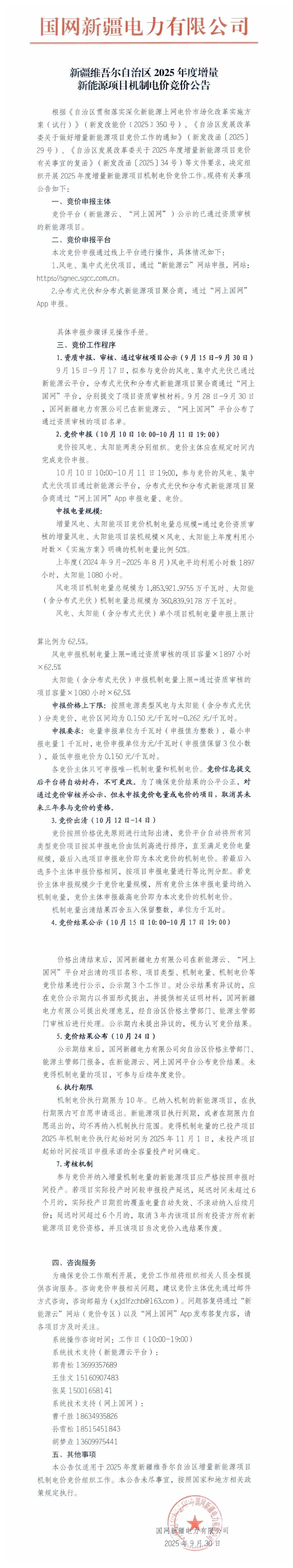 中國儲能網(wǎng)訊:9月30日,新疆維吾爾自治區(qū)2025年度增量新能源項目機制電價競價公告。