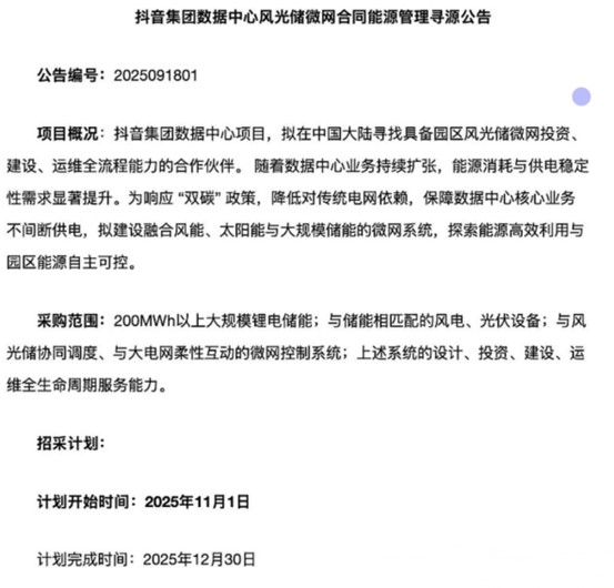 大型互聯(lián)網(wǎng)公司正從傳統(tǒng)的“電力消費者”向“能源基礎設施參與者”轉(zhuǎn)型,主動布局可再生能源和儲能系統(tǒng)。2025年9月,抖音集團發(fā)布了其數(shù)據(jù)中心‘風光儲微網(wǎng)’合同能源管理尋源公告,擬采購200 MWh以上的大規(guī)模鋰電儲能系統(tǒng),并配套風電、光伏設備與微網(wǎng)控制系統(tǒng),以實現(xiàn)風光儲能協(xié)同調(diào)度和對外電網(wǎng)的柔性互動。業(yè)內(nèi)評論認為,此舉在互聯(lián)網(wǎng)行業(yè)具有里程碑意義:一方面表明大型互聯(lián)網(wǎng)公司正從被動的電力用戶轉(zhuǎn)變?yōu)榉e極的能源管理者和貢獻者;另一方面也意味著“風光儲微網(wǎng)”解決方案將成為未來算力基礎設施建設的標配選項之一。