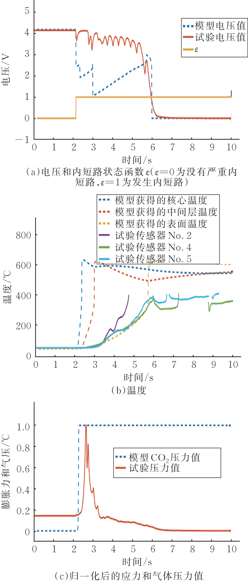 在正常使用工況下,電池的膨脹力由電池溫度變化和SOC變化分別引起的膨脹組成,MOHAN S等通過公式F=FT+FSOC對其進行描述,其中FT和FSOC分別表示溫度和SOC引起的膨脹力;CAI T等研究了內(nèi)部短路條件下電池的膨脹力,建立了熱失控早期副反應(yīng)的氣體模型,能夠準(zhǔn)確捕捉到電池在熱失控早期的膨脹力變化。與電壓和溫度等其他參數(shù)相比,在熱失控的早期階段,膨脹力被監(jiān)測到的時間更早,如圖3所示,證明了利用膨脹力進行預(yù)警的可行性。