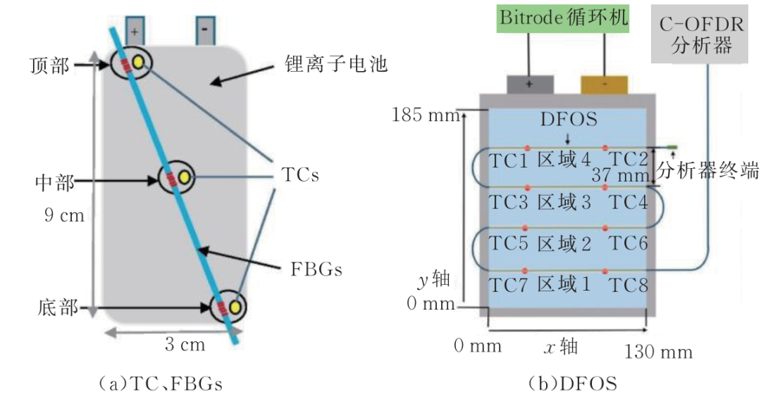 除了熱電偶外,使用光纖傳感器(FOS)測量電池溫度也具有良好的發(fā)展前景。與熱電偶和熱敏電阻相比,F(xiàn)OS通常重量輕,物理尺寸較小,能夠承受高溫等惡劣環(huán)境并提供更有效的帶寬,這對于查詢電池組中的溫度傳感網(wǎng)絡(luò)很有用。NASCIMENTO M等使用光纖布拉格光柵光學(xué)傳感器(FBG)和K型熱電偶比較了鋰電池在不同恒流充電和放電倍率(0.53C、2.67C和8.25C)下,3個不同位置(電池的頂部、中部和底部)的溫度,如圖4(a)所示。試驗結(jié)果表明,F(xiàn)BG比熱電偶具有更高的分辨率。此外,F(xiàn)OS的多路復(fù)用功能使得可以在單根光纖上提供多個監(jiān)測點,從而在高測量點密度的情況下實現(xiàn)最小的布線要求,適用于大型鋰電池組的多點測量,如圖4(b)所示。