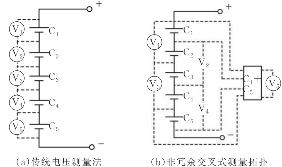 目前,BMS依靠端電壓和表面溫度測量來監(jiān)測熱失控。由于故障的相似性(如傳感器故障和電池故障)和隱藏性(如內(nèi)部短路和連接故障),早期的BMS只能診斷簡單的電池故障,如過充、過放和過熱等,并且預(yù)警時間較晚。為了提高準(zhǔn)確性,端子電壓的監(jiān)測變成了冗余電池電壓傳感器拓?fù)錅y量。雖然這種方法提供了良好的精度和冗余度,但它相應(yīng)地使所需的傳感器數(shù)量、布線、空間占用和成本加倍。如圖5所示,電壓傳感器交叉連接,串聯(lián)的傳感器數(shù)量與電池數(shù)量相同。并且,由于電壓傳感器直接連接到電極,所以排除了來自連接線之間的電阻干擾。這種測量拓?fù)湓诒WC精度的基礎(chǔ)上基本上不增加系統(tǒng)的硬件和復(fù)雜性。但電壓變化的規(guī)律性較差,并且在電壓發(fā)生顯著變化之前熱失控已經(jīng)發(fā)生。因此,將電壓降低信號作為熱失控的預(yù)警信號,需要結(jié)合其他特征參數(shù)進行綜合判斷。