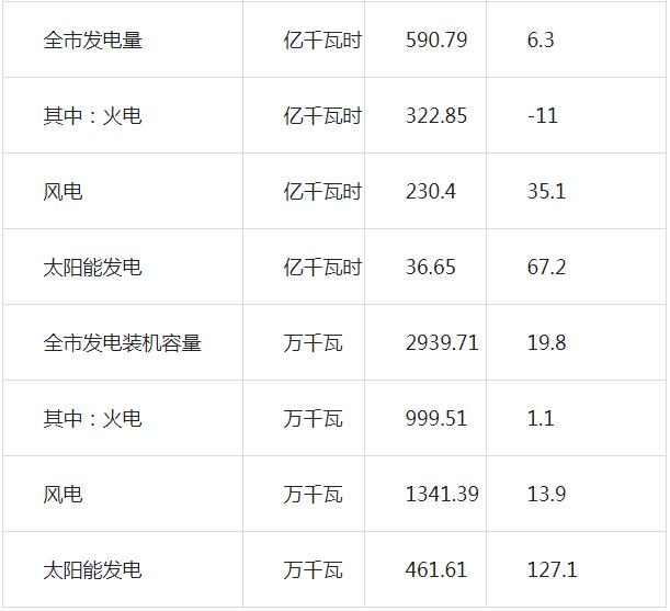 1-9月份,全市發(fā)電量590.79億千瓦時,同比增長6.3%。其中,火電322.85億千瓦時,同比下降11%;風電230.4億千瓦時,同比增長35.1%;太陽能36.65億千瓦時,同比增長67.2%,儲能0.02億千瓦時,與去年同期持平;生物質(zhì)發(fā)電0.87億千瓦時,同比增長26.1%。