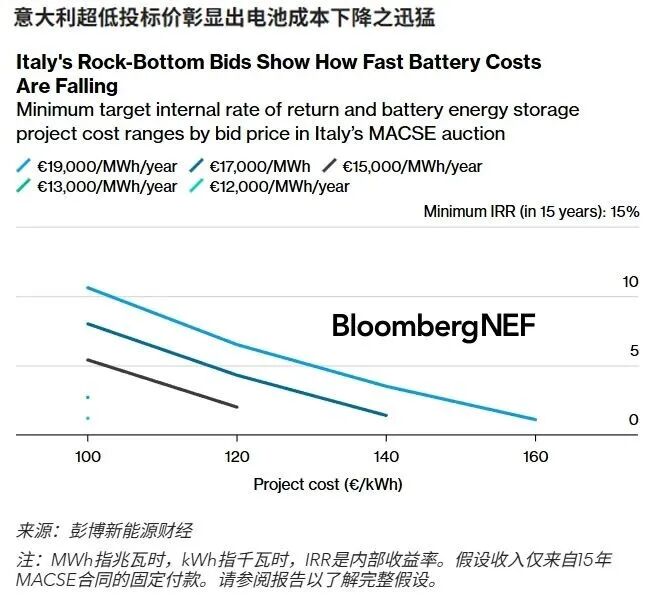 意大利首次大型儲能競價的投標價創(chuàng)下紀錄低點,僅為每年12,000-19,000歐元(13,300-21,000美元)/MWh,遠低于預期,彰顯電池成本正大幅下降。在全球供應格局變化和價格競爭激烈的背景下,開發(fā)商似乎愿意接受接近于零的回報底線,以確保長期合同。
