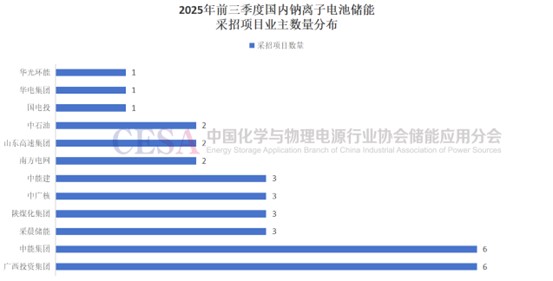 2025年前三季度鈉電儲(chǔ)能中標(biāo)公示(含中標(biāo)候選人公示)的項(xiàng)目業(yè)主中,廣西投資集團(tuán)和申能集團(tuán)兩家領(lǐng)跑,各自采招了6個(gè)項(xiàng)目,數(shù)量占比均為18.18%,并列第一。