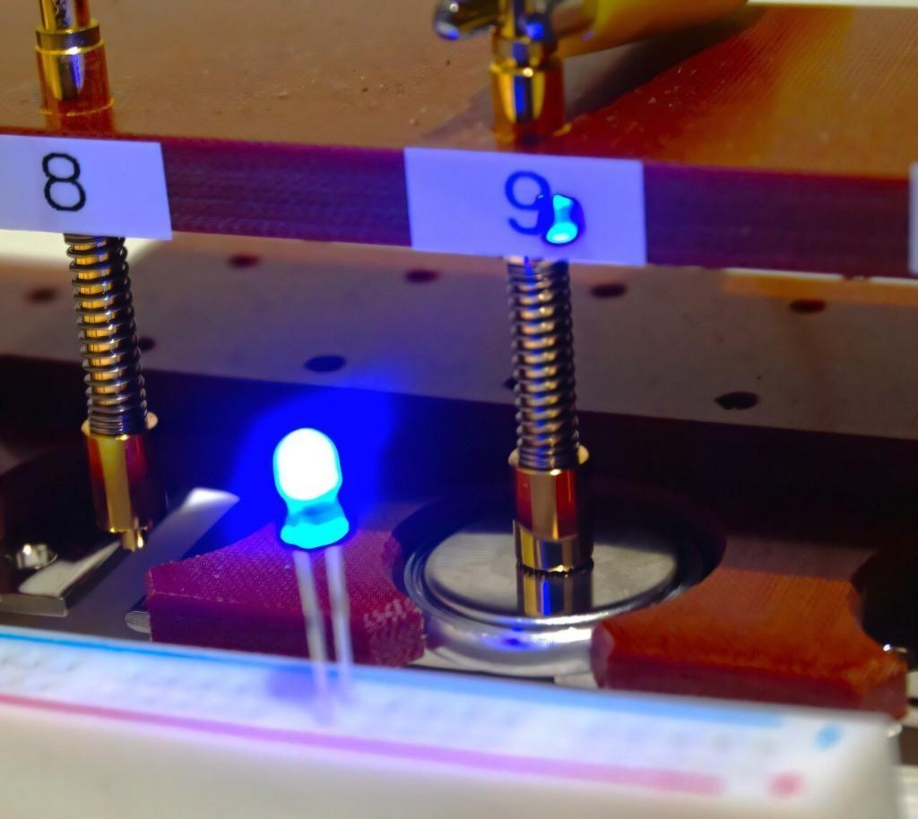 為驗(yàn)證性能,研究人員制作了全尺寸原型電池進(jìn)行測(cè)試。結(jié)果顯示,即使經(jīng)過(guò)200次充放電循環(huán),電池仍能保持穩(wěn)定的能量輸出。在電壓測(cè)試中,該電池成功點(diǎn)亮了一個(gè)藍(lán)色發(fā)光二極管。這表明電池已具備向外部電路供電的能力。