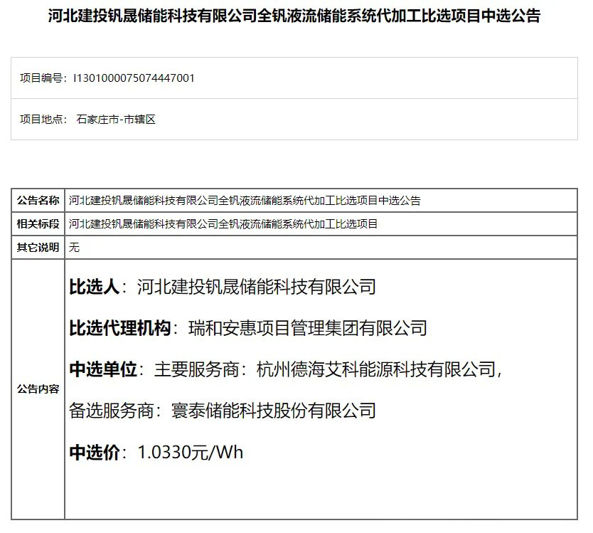 中國儲能網(wǎng)訊:10月15日,河北建投釩晟儲能科技有限公司全釩液流儲能系統(tǒng)代加工比選項目中選公告發(fā)布,杭州德海艾科能源科技有限公司中選為主要服務(wù)商,寰泰儲能科技股份有限公司為備選服務(wù)商,中選價:1.0330元/Wh。