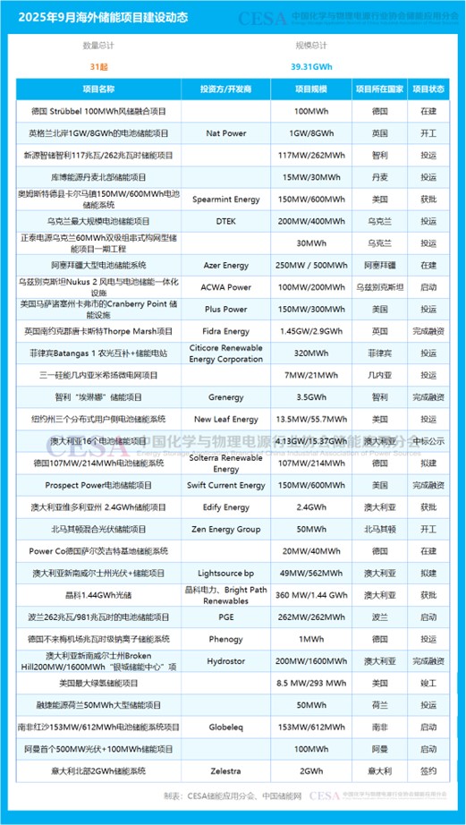 中國(guó)儲(chǔ)能網(wǎng)訊:2025年9月,CESA儲(chǔ)能應(yīng)用分會(huì)產(chǎn)業(yè)數(shù)據(jù)庫(kù)追蹤到31起海外儲(chǔ)能項(xiàng)目建設(shè)動(dòng)態(tài)事件,總規(guī)模為39.31GWh,涉及Nat Power、Spearmint Energy、DTEK、Azer Energy、ACWA Power、Plus Power、Fidra Energy、Grenergy、New Leaf Energy、PGE、Phenogy、Hydrostor、Globeleq、Zelestra等全球能源投資方/開發(fā)商,建設(shè)地點(diǎn)位于澳大利亞、美國(guó)、德國(guó)、烏克蘭、英國(guó)、智利、阿曼、阿塞拜疆、北馬其頓、波蘭、丹麥等國(guó)家。