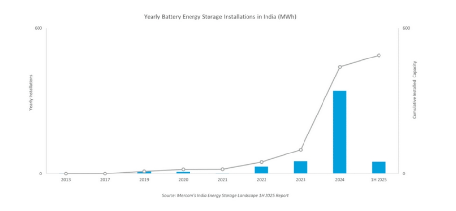 中國儲能網訊:日前,根據(jù)清潔能源市場研究機構Mercom India公司發(fā)布的《2025年上半年印度儲能前景》報告,印度在2025年上半年累計部署的儲能系統(tǒng)裝機容量約為49MWh。
