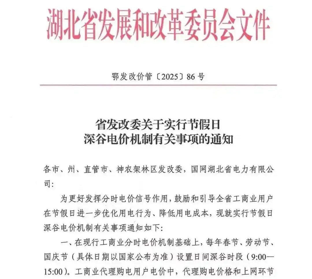 以湖北為例,其早在 2025 年 4 月,湖北發(fā)改委便出臺專項通知,明確提出,自2025年5月1日起,在現(xiàn)行工商業(yè)分時電價機制基礎(chǔ)上,每年春節(jié)、勞動節(jié)、國慶節(jié)設(shè)置日間深谷時段(9:00—15:00),即實施6小時深谷電價。