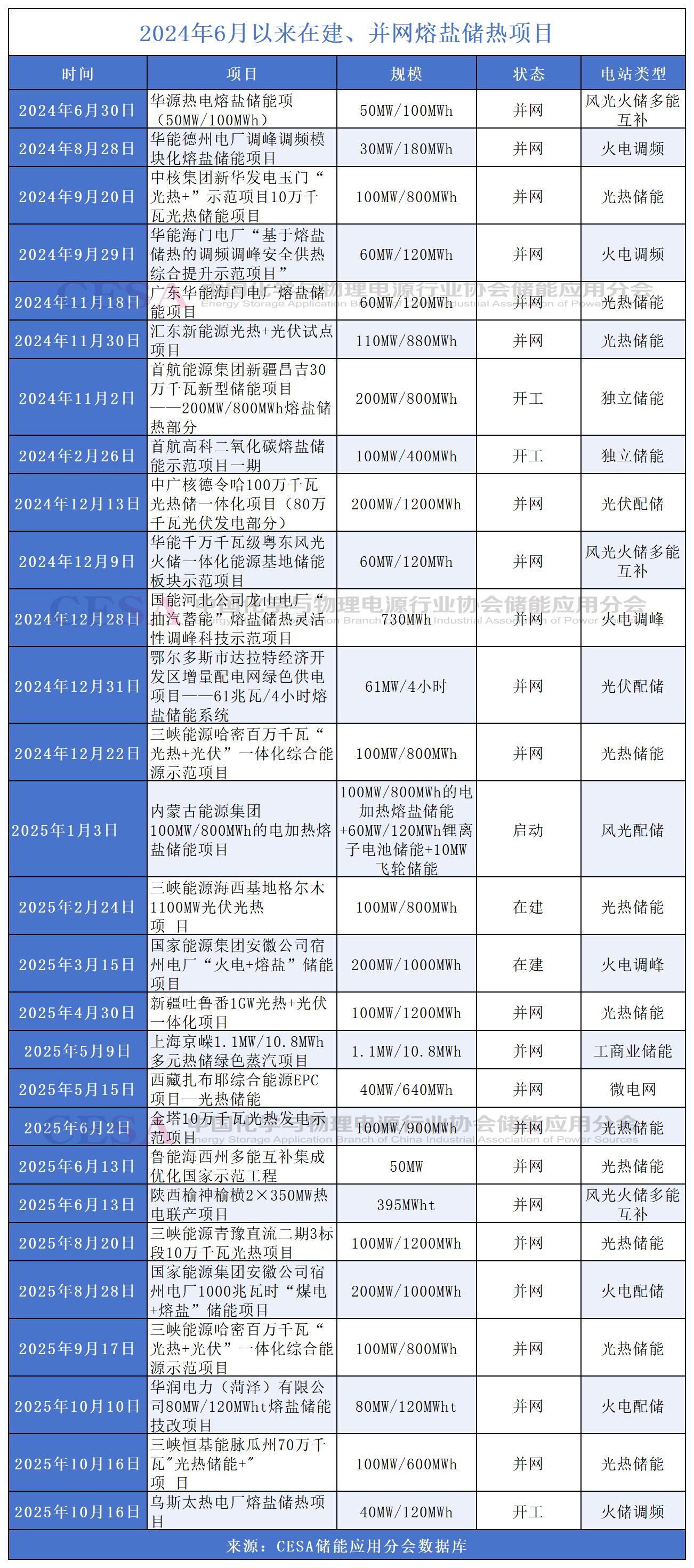 光熱發(fā)電產(chǎn)業(yè)的壯大推動著熔鹽儲熱的規(guī)模化應(yīng)用,據(jù)CESA儲能應(yīng)用分會產(chǎn)業(yè)數(shù)據(jù)庫不完全統(tǒng)計,在2025年1-9月中國新型儲能31.77GW新增裝機功率中,熔鹽儲熱功率占比排名第三;另外,2024年6月以來,熔鹽儲熱在建、并網(wǎng)的項目共28個,其中,應(yīng)用于光熱發(fā)電的項目共11個,其中多個項目的技術(shù)應(yīng)用處于世界領(lǐng)先地位。