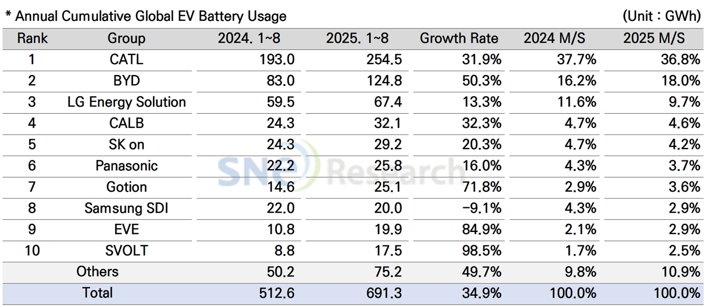 2025年1-8月全球動力電池企業(yè)裝機量 圖片來源:SNE Research
