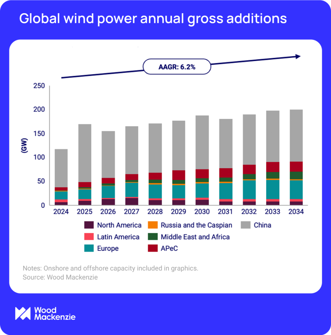 在本季度的預(yù)測(cè)中,我們將全球風(fēng)電裝機(jī)預(yù)測(cè)較上季度上調(diào)13%,主要由于中國(guó)陸上風(fēng)電市場(chǎng)預(yù)測(cè)大幅增長(zhǎng)。到2032年,全球風(fēng)電裝機(jī)容量將較2024年的水平翻倍。盡管美國(guó)等主要市場(chǎng)受政策的影響較大,但未來(lái)10年,行業(yè)仍將達(dá)到歷史性規(guī)模。在除中國(guó)外的市場(chǎng),2031年全球風(fēng)電累計(jì)裝機(jī)容量將達(dá)1TW,且到2034年全球裝機(jī)容量將較2024年水平翻倍。