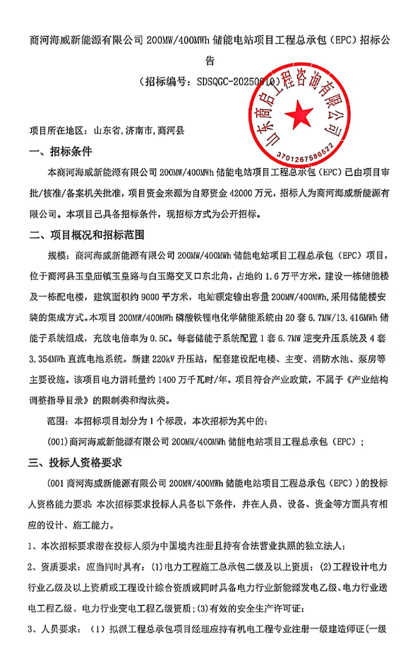 中國儲能網訊:10月23日,商河海威新能源有限公司200MW/400MWh儲能電站項目工程總承包(EPC)招標公告發(fā)布。項目位于山東省濟南市商河縣,本項目200MW/400MWh磷酸鐵鋰電化學儲能系統由20套6.7MW/13.416MWh儲能子系統組成。每套儲能子系統配置1套6.7MW逆變升壓系統及4套3.354Mh 直流電池系統。新建 220kV升壓站,配套建設配電樓、主變、消防水池、泵房等主要設施。該項目電力消耗量約1400萬千瓦時/年。項目符合產業(yè)政策,不于《產業(yè)結構調整指導目錄》的限制類和淘汰類。