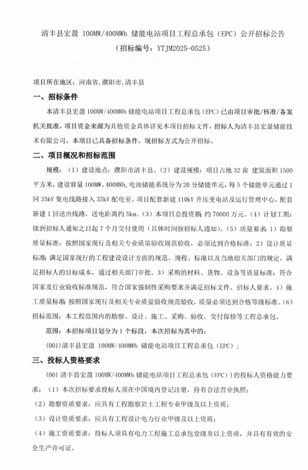 中國儲能網(wǎng)訊:10月24日,清豐縣宏盈儲能技術(shù)有限公司發(fā)布清豐縣宏盈100MW/400MWh儲能電站項目工程總承包(EPC)公開招標(biāo)公告。