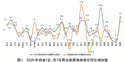 7月1日,國(guó)家發(fā)改委辦公廳、國(guó)家能源局綜合司聯(lián)合下發(fā)2025年、2026年可再生能源電力消納權(quán)重和重點(diǎn)用能行業(yè)綠色電力消費(fèi)比例,在電解鋁行業(yè)基礎(chǔ)上,2025年增設(shè)鋼鐵、水泥、多晶硅行業(yè)和國(guó)家樞紐節(jié)點(diǎn)新建數(shù)據(jù)中心綠色電力消費(fèi)比例。盡管新增的四個(gè)行業(yè)2025年僅監(jiān)測(cè)不考核,但對(duì)重點(diǎn)用能企業(yè)的綠色消費(fèi)將起到重要的指引與導(dǎo)向作用。從消納責(zé)任要求看,各?。▍^(qū)、市)非水電消納責(zé)任權(quán)重同比增加0%~10.6%不等(見圖1),其中云南、新疆增加最多,分別增加10.6%與7.9%;吉林、黑龍江、青海、寧夏與2024年持平,全國(guó)平均增加約4.1%。非水電消納責(zé)任要求的提升可帶動(dòng)2025年綠電綠證消費(fèi)量增加超過4000億千瓦時(shí)。要注意的是,2025年全年風(fēng)電、光伏發(fā)電量預(yù)計(jì)增加超過5000億千瓦時(shí),而跨省區(qū)輸電通道資源緊張,綠電消費(fèi)量存在區(qū)域錯(cuò)配問題,單從數(shù)量上看預(yù)計(jì)多數(shù)地區(qū)綠電消費(fèi)供過于求的局面仍會(huì)維持。