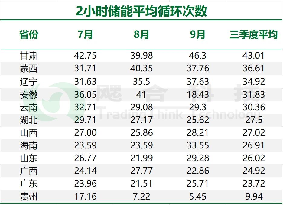 表2:2025年三季度2小時儲能系統(tǒng)月均、季度平均循環(huán)次數(shù)