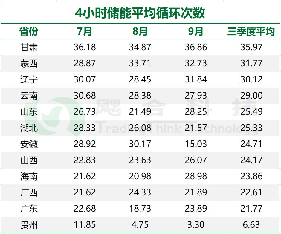 表3:2025年三季度4小時儲能系統(tǒng)月均、季度平均循環(huán)次數(shù)