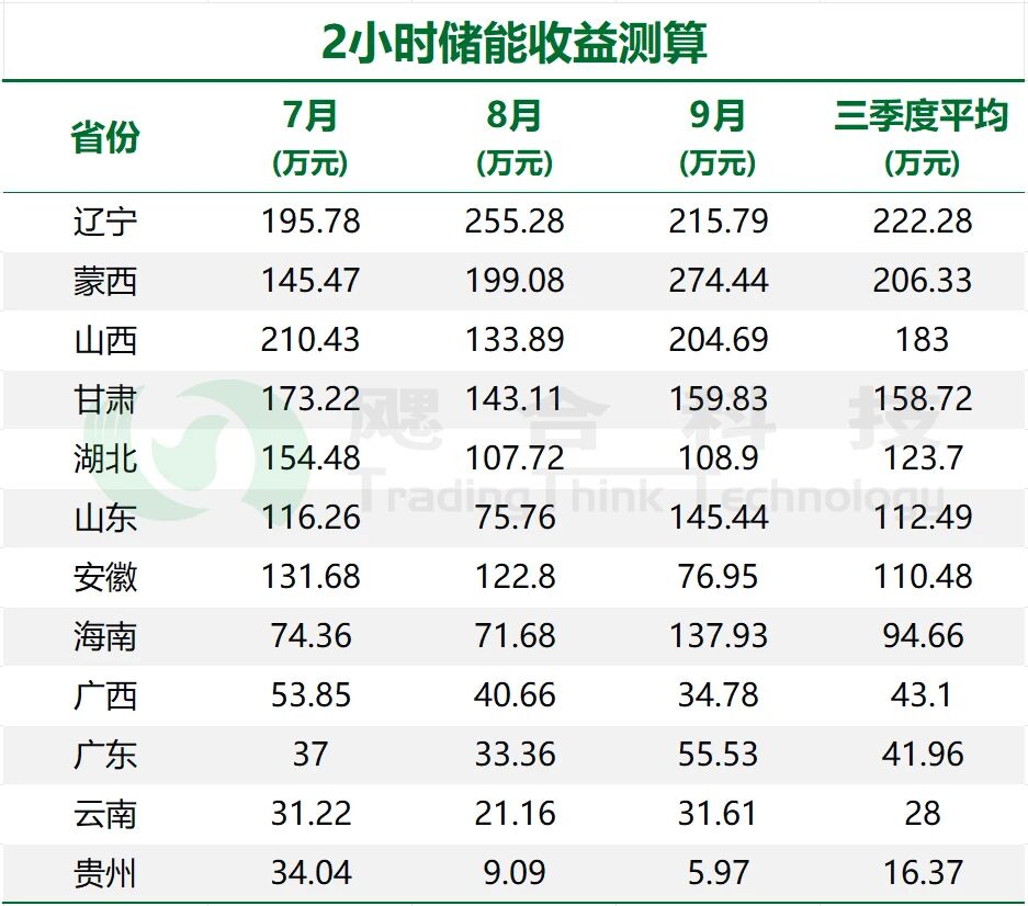 表4:2025年三季度2小時儲能系統(tǒng)月均、季度平均收益