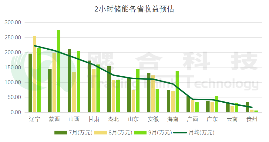 2小時儲能收益中,遼寧、蒙西、山西收益較高,月均收益在180-230萬元之間;南方區(qū)域收益整體偏低。