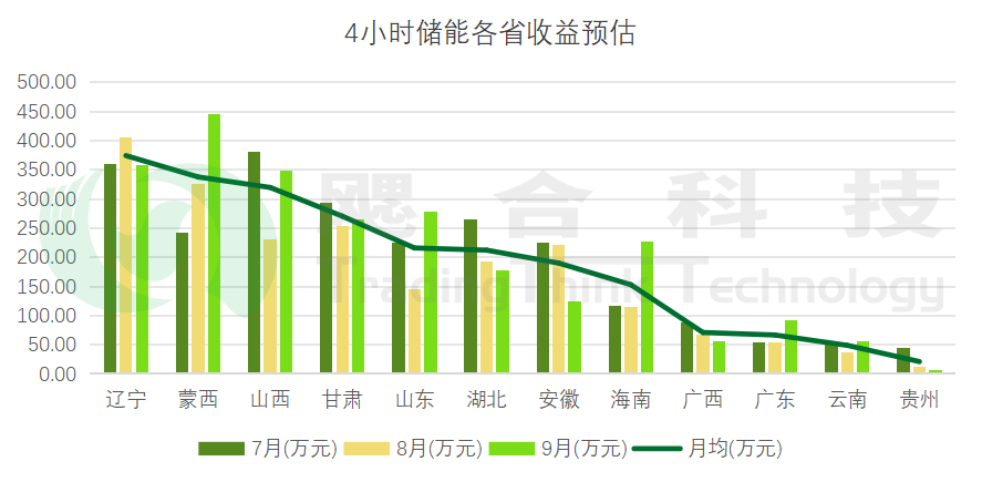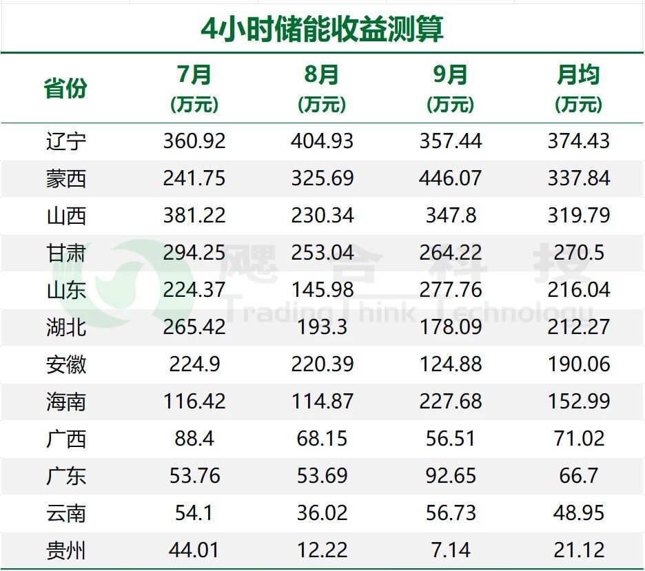 4小時儲能的收益排名與2小時儲能基本一致,第一梯隊仍是遼寧、蒙西、山西三省,月均收益在310-380萬元之間。