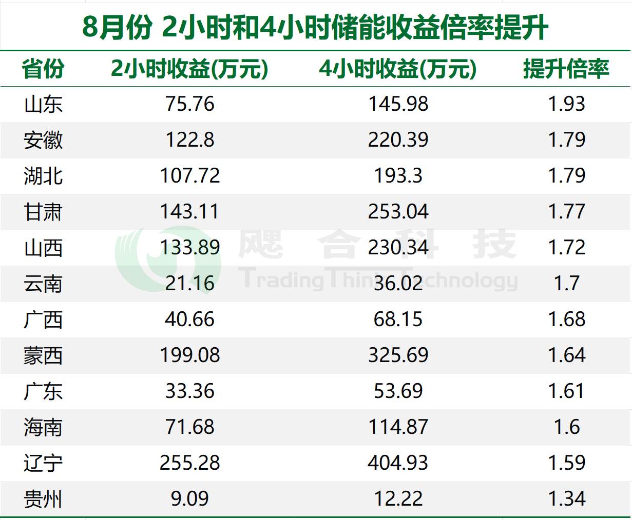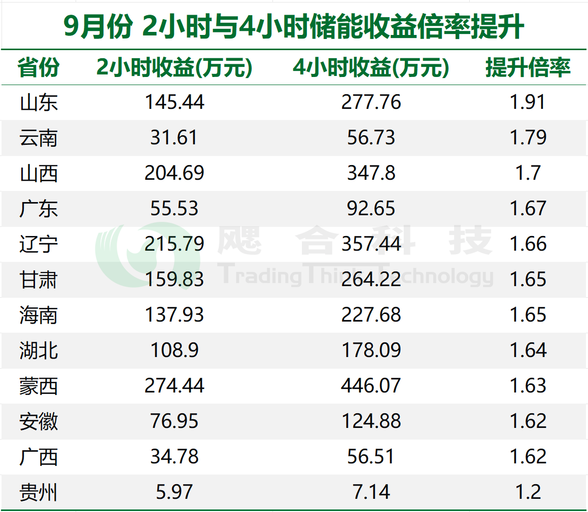 表8:2小時與4小時儲能系統(tǒng),9月份收益倍率提升