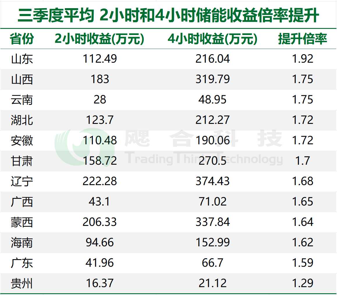 表9:2小時與4小時儲能系統(tǒng),三季度平均收益倍率提升