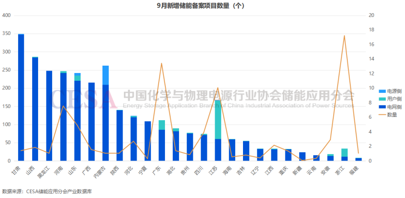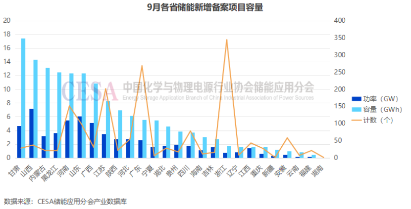 圖2025年9月各省儲能新增備案項目數(shù)量及容量