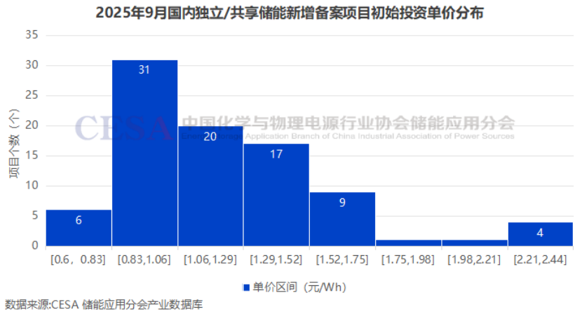 據(jù)CESA儲能應用分會產(chǎn)業(yè)數(shù)據(jù)庫不完全統(tǒng)計,2025年9月,國內新增鋰電池獨立/共享儲能項目中,89個項目公布了有效初始投資單價(注:此處統(tǒng)計已去除無效報價),主要集中在0.6-2.55元/Wh,平均初始投資單價1.2505元/Wh。