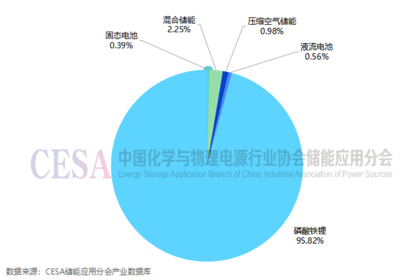 磷酸鐵鋰電池儲能(不含混合儲能中磷酸鐵鋰電池部分)新增備案58.72GW/146.82GWh,占比95.68%(功率)/95.82%(容量)。