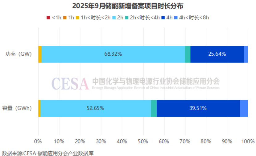 2025年9月,國內新增備案儲能項目中,58.64GW/152.225GWh時長明確,平均時長2.3小時。
