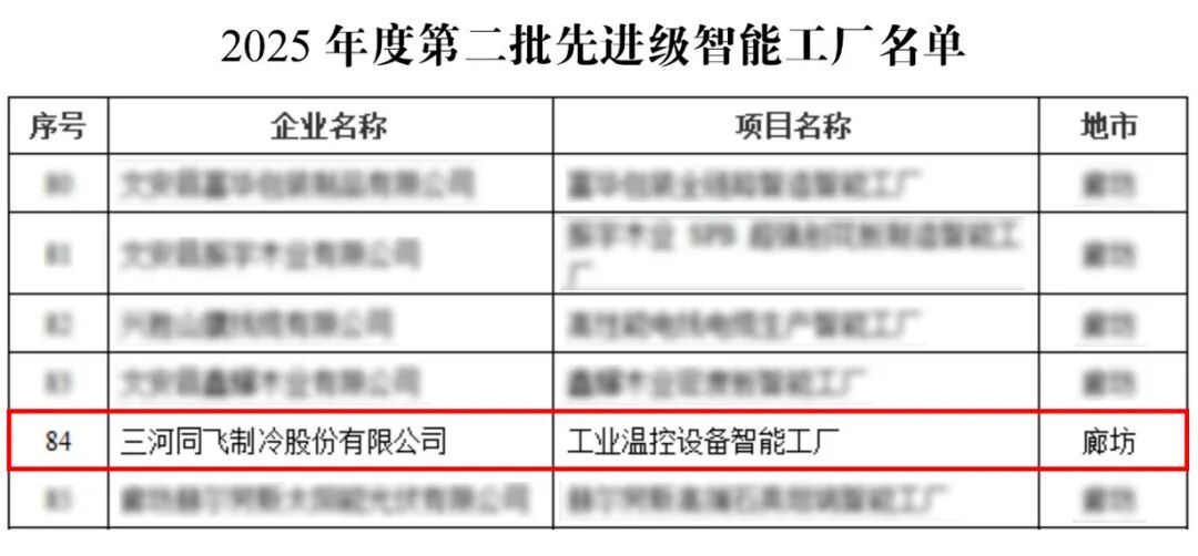 中國(guó)儲(chǔ)能網(wǎng)訊:近日,河北省工業(yè)和信息化廳等六部門(mén)聯(lián)合開(kāi)展的2025年度智能工廠梯度培育行動(dòng)認(rèn)定結(jié)果正式公布,三河同飛制冷股份有限公司(以下簡(jiǎn)稱(chēng)“同飛股份”)憑借在數(shù)字化轉(zhuǎn)型、智能化升級(jí)領(lǐng)域的先進(jìn)經(jīng)驗(yàn),成功獲評(píng)工業(yè)溫控設(shè)備智能工廠,標(biāo)志著公司智能制造水平達(dá)到國(guó)內(nèi)溫控行業(yè)先進(jìn)標(biāo)準(zhǔn),邁入高質(zhì)量發(fā)展新階段。
