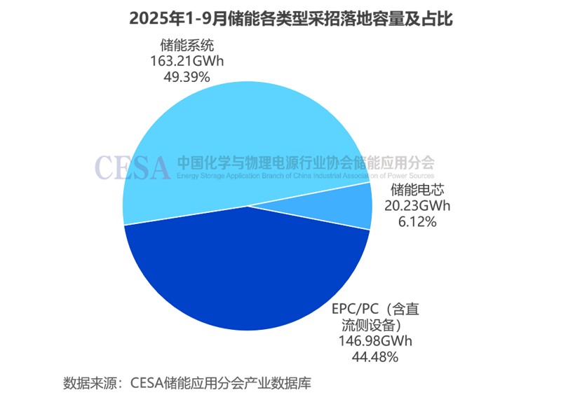 2025年1-9月,儲能EPC/PC(含直流側(cè)設(shè)備)采招落地54.47GW/146.98GWh,容量占同期儲能總需求的44.9%。