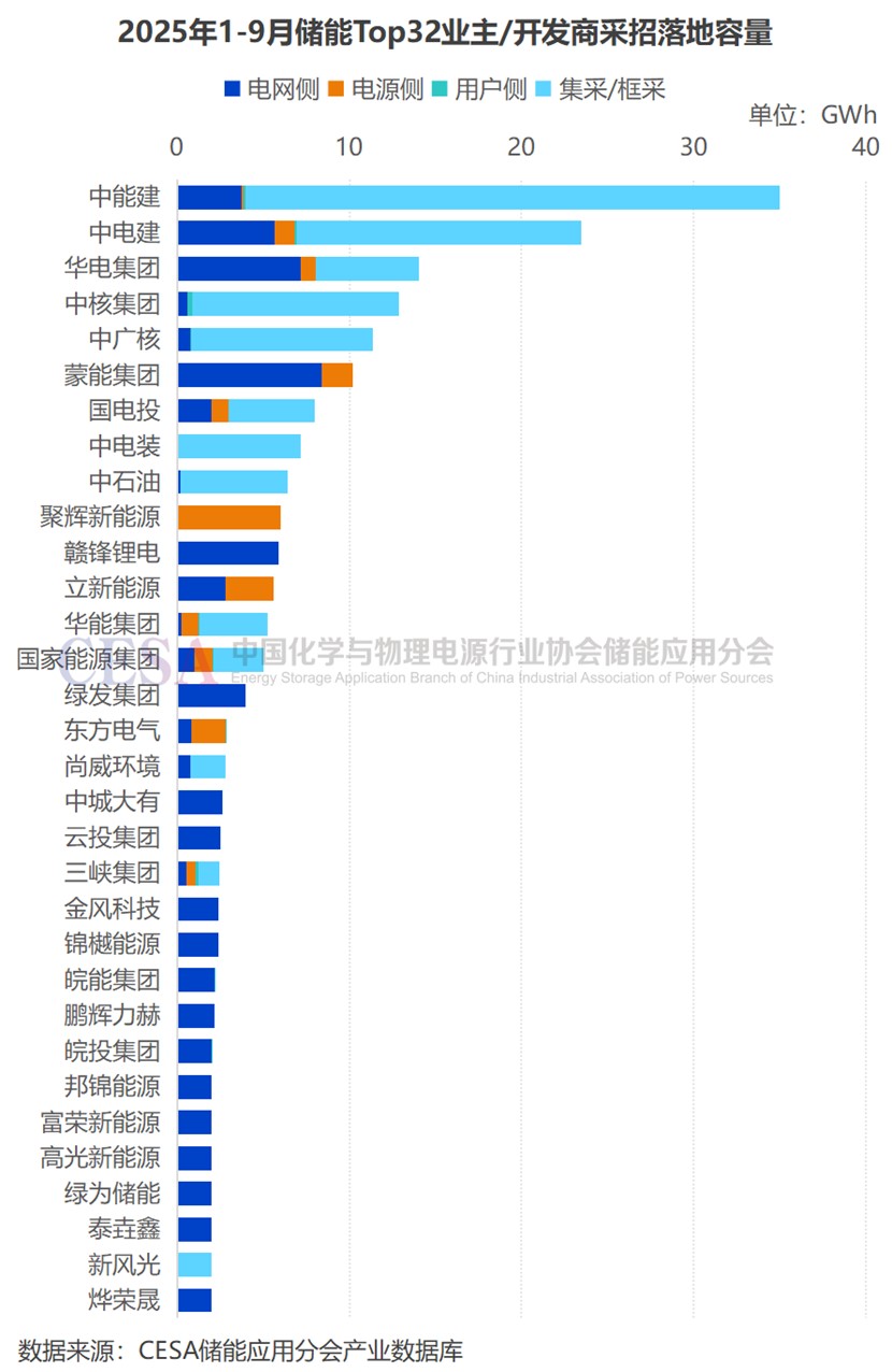 就業(yè)主/開發(fā)商分析,據(jù)CESA儲能應(yīng)用分會不完全統(tǒng)計,2025年1-9月,1257家企業(yè)儲能項目(含集采/框采)采招落地,頂層集團/公司共計732家。其中,中能建一騎絕塵,儲能采招落地34.97GWh,容量占比10.99%。中電建采招落地23.46GWh,容量占比7.38%,位居全國第二。華電集團、中核集團、中廣核、蒙能集團儲能采招落地規(guī)模均超10GWh。國電投、中電裝、中石油、聚輝新能源、贛鋒鋰電、立新能源、華能集團、國家能源集團儲能采招落地規(guī)模都在5GWh以上。
