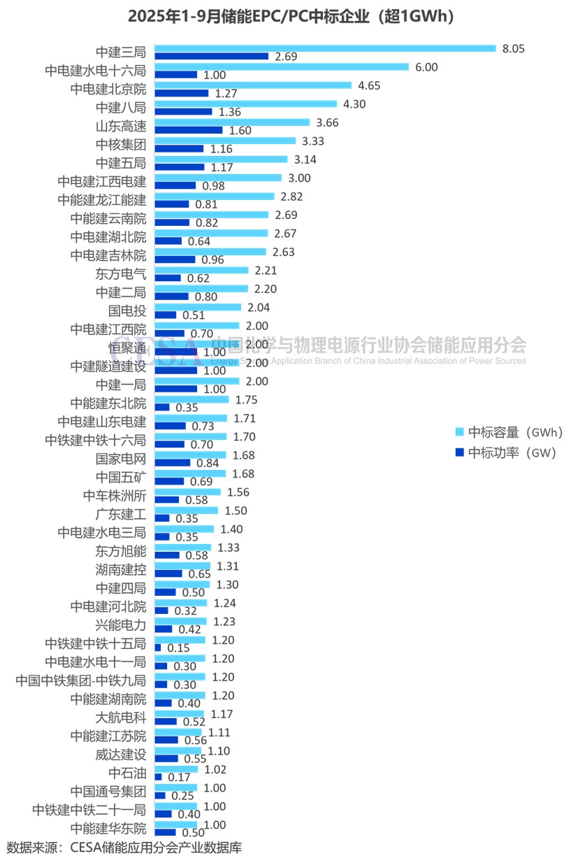 中電建、中建、中能建三大集團儲能EPC/PC合計市場占比超過50%,頭部集中度較高。