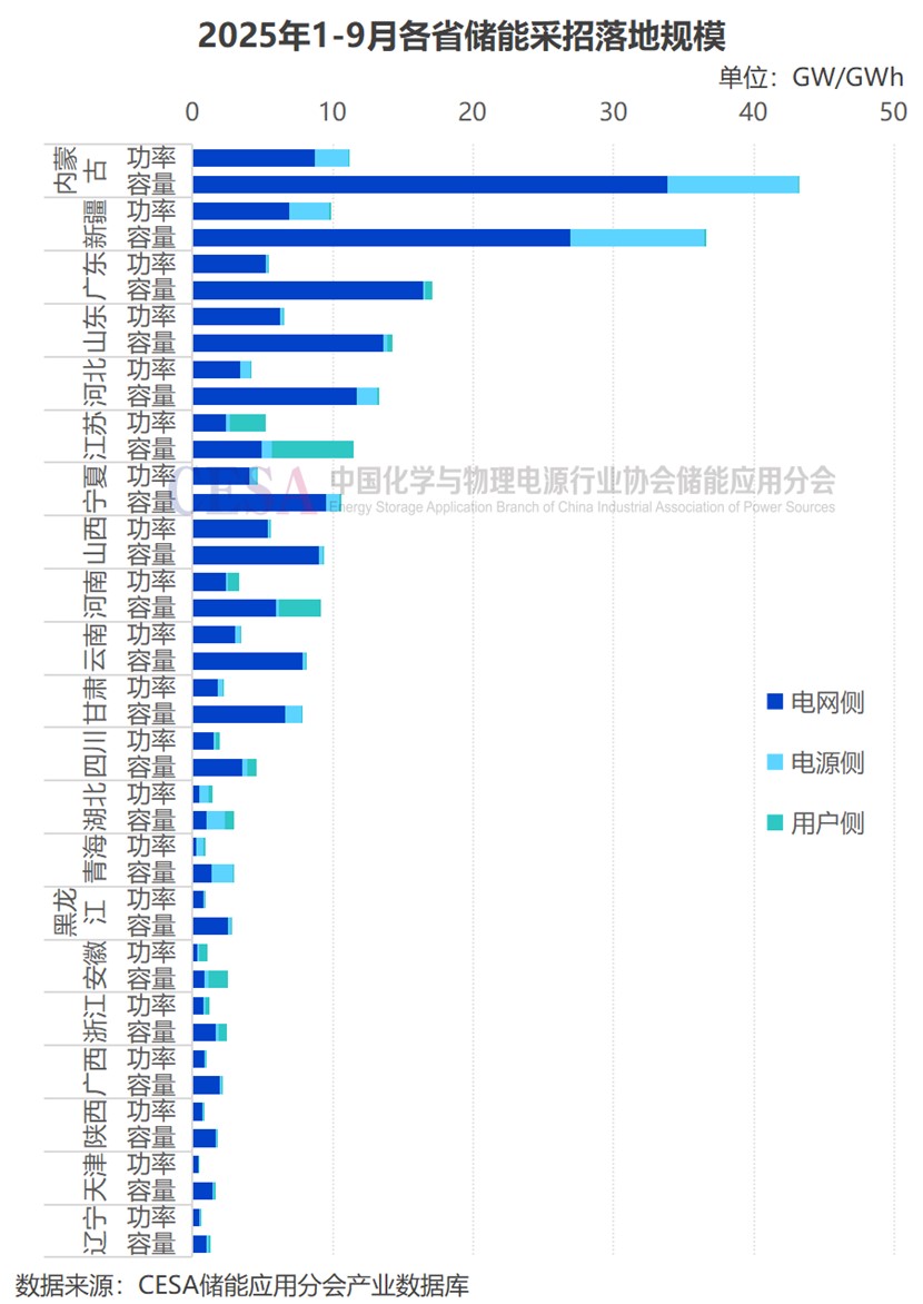從項目類應(yīng)用場景來看,1-9月,電網(wǎng)側(cè)儲能采招落地57.35GW/165.8GWh,占已知應(yīng)用場景采招落地項目類的78.35%(功率)/79.04%(容量);用戶側(cè)5.56GW/14.43GWh,占比7.59%(功率)/6.88%(容量)。相比去年,電網(wǎng)側(cè)和用戶側(cè)儲能占比均有所提升。電源側(cè)儲能采招落地10.3GW/29.53GWh,占比僅14.06%(功率)/14.08%(容量)。
