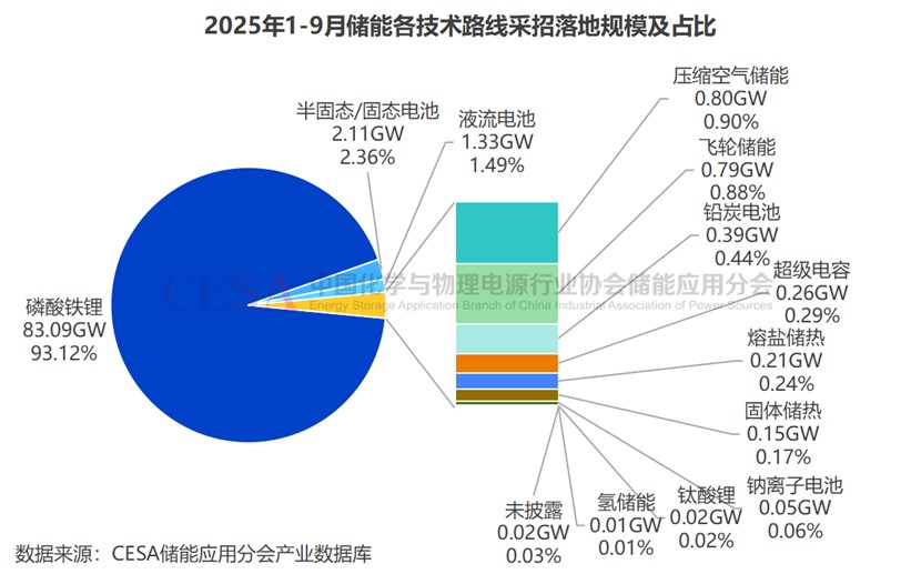 據(jù)CESA儲能應(yīng)用分會產(chǎn)業(yè)數(shù)據(jù)庫不完全統(tǒng)計,2025年1-9月,磷酸鐵鋰電池儲能項目(含混合儲能項目中磷酸鐵鋰電池部分)采招落地規(guī)模高達(dá)83.09GW/295.47GWh,占比93.12%(功率)/91.99%(容量),穩(wěn)居絕對主導(dǎo)地位。成本成熟、產(chǎn)業(yè)鏈完善使其成為當(dāng)前集中式和工商業(yè)儲能的首選路線。