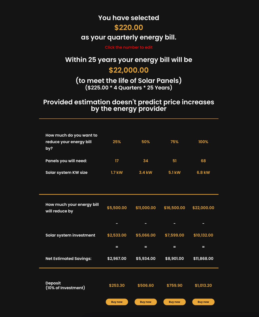 如果一名用戶每季度電費支出約220美元,想要把電費減少25%:系統(tǒng)會建議安裝大約17塊光伏組件,總裝機(jī)容量1.7kW。按照測算,這套系統(tǒng)能為用戶帶來約3000美元的電費節(jié)省。